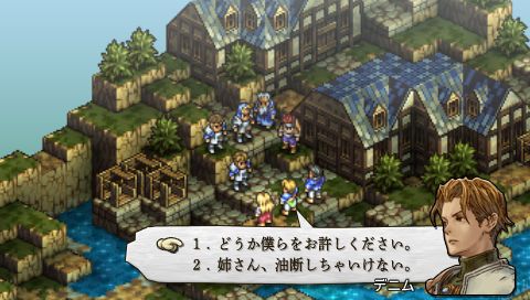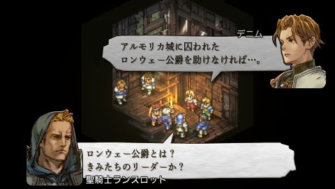 聖騎士ランスロットの一行に事情を説明するデニムたち。 意見の食い違いがあったものの、 相互理解を果たした彼らは、 アルモリカ城に幽閉中のロンウェー公爵の救助を計画する。