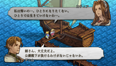しかしデニムは海路を使ったアルモリカへの帰還を決意。 今さら投げ出すなんて、 あの虐殺の犠牲者・遺族に顔向けできません。 ヒドいよ、 姉さん。