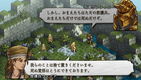 そこには退却の途にあるガルガスタンの将軍と救護兵たち。 傷ついた将軍を逃がすため、 救護兵たちは身命をなげうって立ち向かってきます。 武器も持ってないのに。 …た、 戦いづらい。