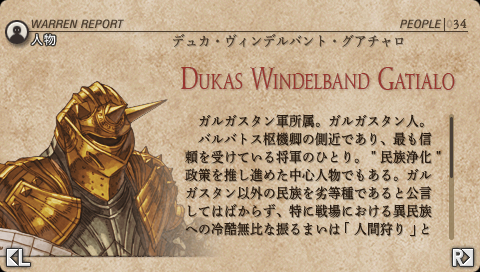 ザパンによると 「ウォルスタ人を見ると嬉々として “人間狩り” を始めやがる」 という梟将グアチャロ。 ウィノアのような非戦闘員をバッサバッサと斬り捨てて罪悪感に苛まれている身としては、 将軍が非情な差別主義者だったことがむしろ精神的には救いです。