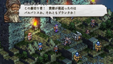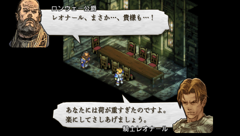ロンウェー公爵を暗殺したレオナールは、 デニムに剣を向ける。 そこへヴァイスとアロセールがかけつけ、 4対1の戦いとなる。