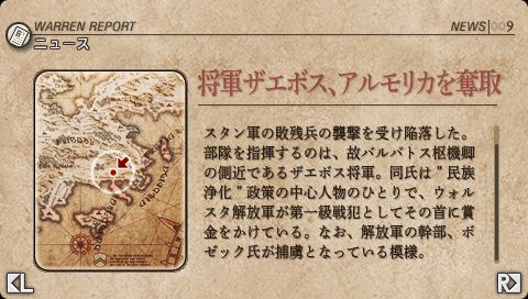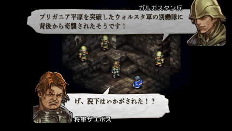 スウォンジーの森で被害を出しながらも、 かろうじて勝利をおさめたガルガスタン軍はクリザローの町まで進軍していた。 捕えたヴァイスを拷問にかける指揮官のザエボス将軍の下に、 コリタニ城陥落の知らせが入った…。
