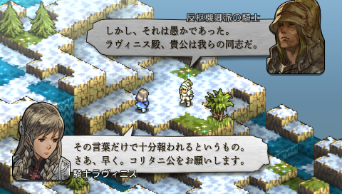 政治の道具として枢機卿に利用されていた幼きコリタニ公を護るため、 ガルガスタンの反枢機卿派として活動していたというラヴィニス。 憎むべきは “戦争” であって互いの民族ではないとの主張は今のデニムのこれと一致し、 両者は再び共闘の道を進みます。