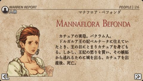 タルタロスの話を要約すると、 カチュアはドルガルア王の娘。 ただし母は王妃ではなく侍女のマナフロア。 そのマナフロアも王妃も王も死亡。 幼いカチュアはその存在すら世間に知られないまま、 プランシー神父の娘として育てられることに。 事実を知るのはプランシー神父と、 彼にカチュアを預けたブランタだけとなっていた。 カチュアの紅光の首飾りに刻まれた 「我が娘ベルサリアに永遠の愛を」 の古代文字がその証拠、 とのこと。