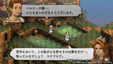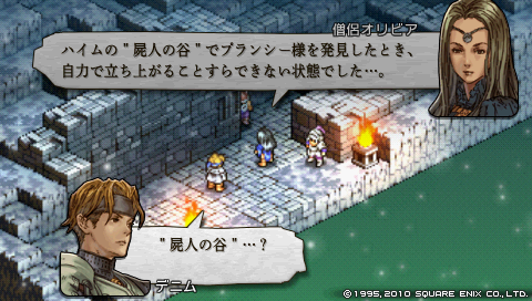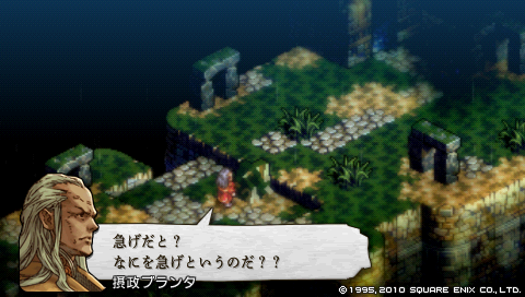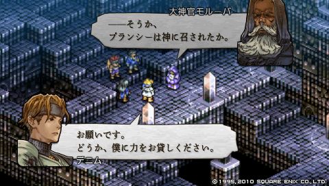 動揺し、 取り乱すデニムをオリビアが諌めます。 デニムは父の遺言に従い、 失踪中のオリビアの父、 大神官モルーバを捜すため、 バンハムーバ島の神殿へ向かうことを決めます。