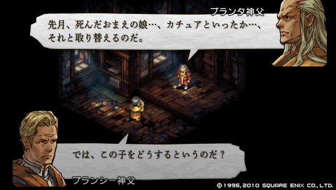 暗黒騎士団は単に政治的な目的だけでなく、 ドルガルア王の遺産を手に入れるために王家の血を引くカチュアを利用していると、 これもプランシーが死ぬ前に語りました。