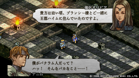 父の死に消沈するデニムに、 オリビアの語る真実が追い討ちをかけます。 それは摂政ブランタとプランシー神父は兄弟であること。 すなわちデニムはウォルスタ人ではなくバクラム人であることを。