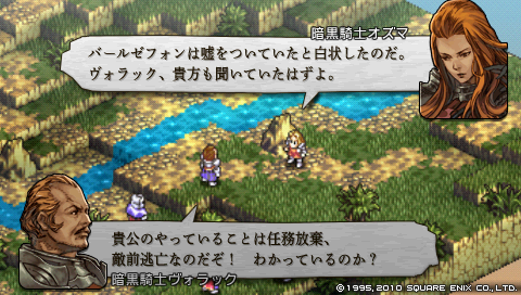敵がベルサリア王女を擁したことで、 解放軍の戦意が下がっていることを挙げ、 側近はハイム侵攻の早期実行を具申します。 しかしデニムは暗黒騎士団の真意が見えない現状での進軍をためらいます。