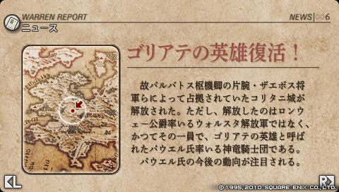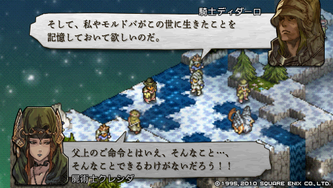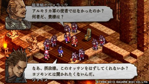 デニムはウォルスタ人のためだけに戦ってきたこれまでを振り返り、 民族に関係なく、 苦しんでいる人たちのためにこそ戦うべきだと気づきました。 そう、 民族紛争は権力者が私利私欲のために焚きつけたものなのです。 そしてこれよりコリタニ城を攻めることを決めます。 ガルガスタンの残党を倒すのが目的だそうですが…。