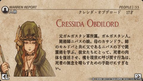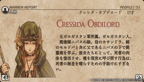 ブリガンテスへの道中、 ガ軍の屍術士カサンドラと、 その娘のクレシダと遭遇。