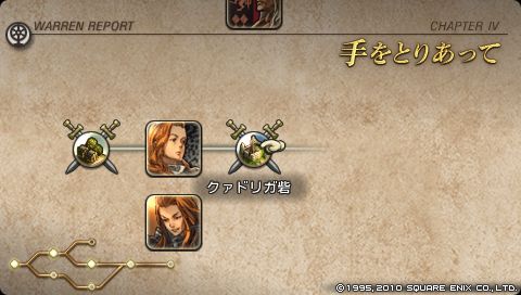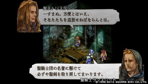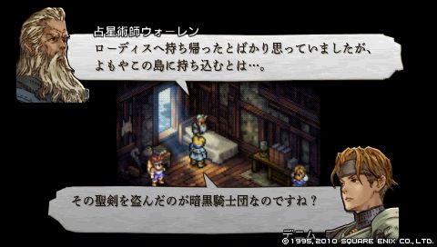 内政干渉が目的ならこの島から退去させると迫るデニムに、 ようやく重い口を開いたウォーレン。 彼らはゼノビアの聖王トリスタンからの特命で、 暗黒騎士団に奪われた聖剣を奪還するためにこの島を訪れたとのこと、 また彼らが聖剣を盗んだ理由についてはわからないとのこと。