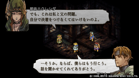 なりふり構わずの作戦行動でどうにか助け出したクレシダですが、 デニムからの共闘を誘いについてはこれを拒絶。 やむなくデニムはここを去ります。